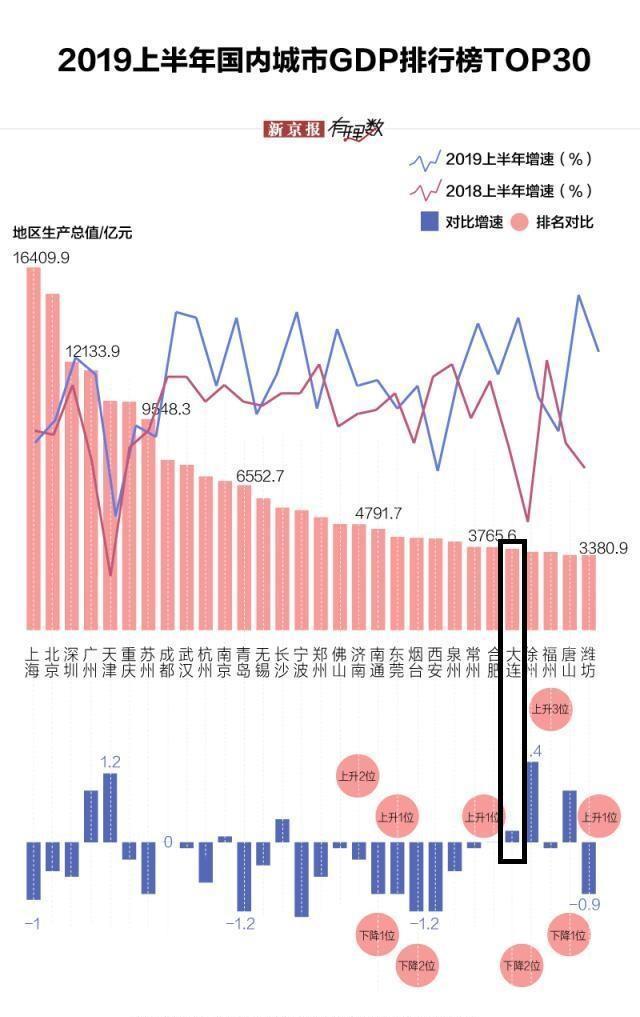 在2019年上半年,大连市的GDP总量排名全国第2位,按照统计来看,大连市其实下降了两个位次。比如目前排名全国25位的合肥市,其实可能就是反超了大连市。