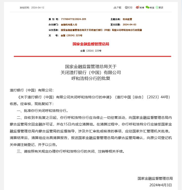4 月 12 日,国家金融监督管理总局浙江监管局公示批复,同意澳大利亚和新西兰银行(中国)有限公司杭州分行关闭。同一日,国家金融监督管理总局公示,批准渣打银行(中国)有限公司关闭呼和浩特分行。