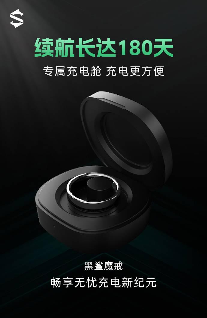 在续航方面,黑鲨魔戒拥有 16 mAh 的电池,单次充满电后可使用 4 - 6 天。配合专属充电舱使用,黑鲨魔戒的续航将可以达到 180 天。