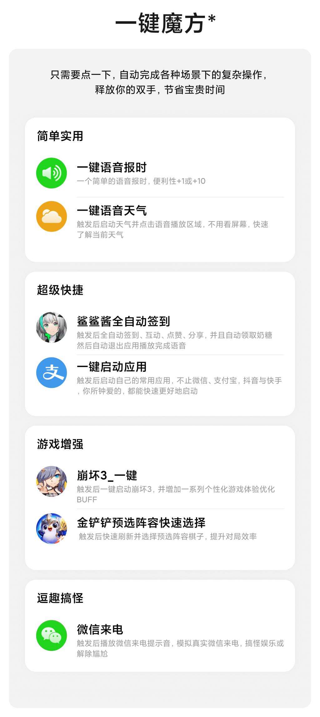 不过目前「一键魔方」功能仅适配了黑鲨游戏手机,华为、小米、OPPO、vivo 等其他品牌手机还在陆续适配中。