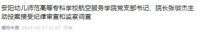 安阳幼儿师范高等专科学校航空服务学院党支部书记、院长张敏杰涉嫌严重违纪违法,主动投案,目前正接受安阳市纪委监委纪律审查和监察调查。