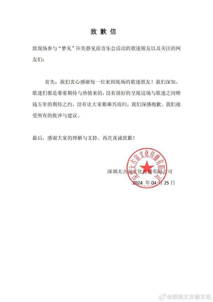 4 月 26 日,就许美静演唱会相关争议,主办方 @深圳太古宙文化 发布致歉信。文中称:首先,我们衷心感谢每一位来到现场的歌迷朋友 ! 我们深知,歌迷们都是带着期待与热情来的,没有很好的呈现这场与歌迷之间暌违五年的期待之约,没有让大家都乘兴而归,我们深感抱歉。我们接受所有的批评与建议。