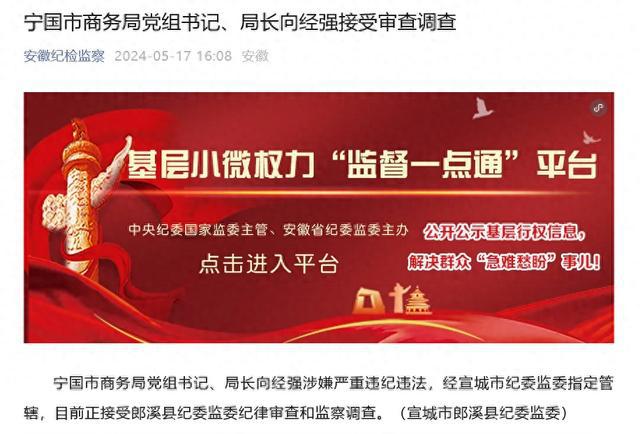 5 月 17 日,据 " 安徽纪检监察 " 消息,宁国市商务局党组书记、局长向经强涉嫌严重违纪违法,经宣城市纪委监委指定管辖,目前正接受郎溪县纪委监委纪律审查和监察调查。