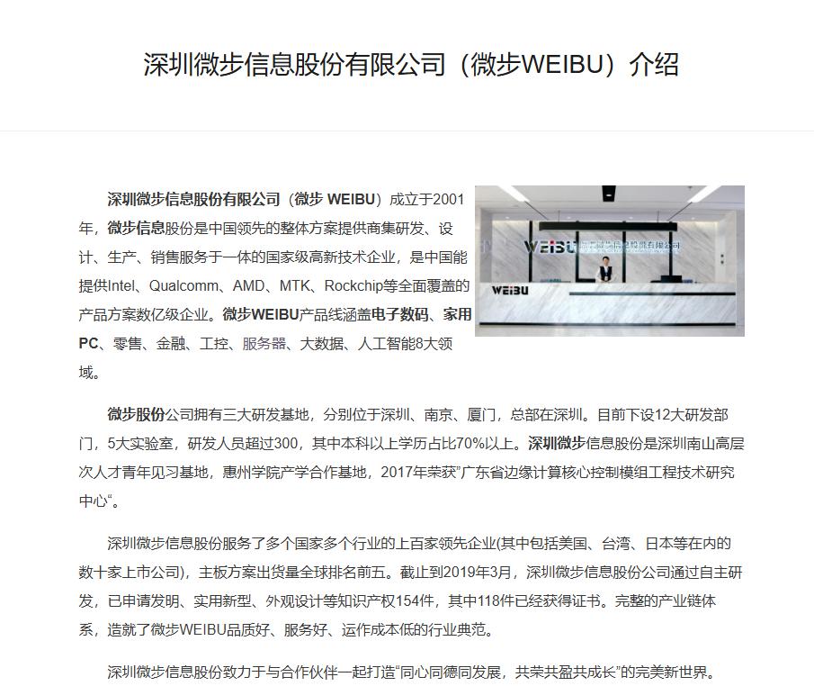 IT 之家查询发现,深圳微步信息股份有限公司成立于 2001 年,产品线涵盖电子数码、家用 PC、零售、金融、工控、服务器、大数据、人工智能 8 大领域。