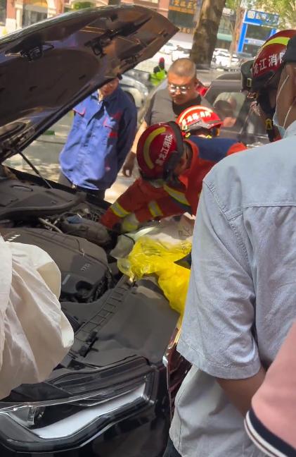 据目击者刘先生介绍:17 日自己开车路过看到这一幕,一条大蛇钻进路旁轿车机器盖内,一旁社区卫生服务中心工作人员发现后报警,接到消息后,消防救援人员立即赶到现场,车主打开机器盖,此时这条大蛇盘踞在发动机下方夹缝处,给救援带来难度,随后消防救援人员徒手抓住蛇的尾部向外拽,和大蛇互相较劲,最后蛇被拽成两截后取了出来,车主表示十分感谢,大家悬着的一颗心终于放了下来。