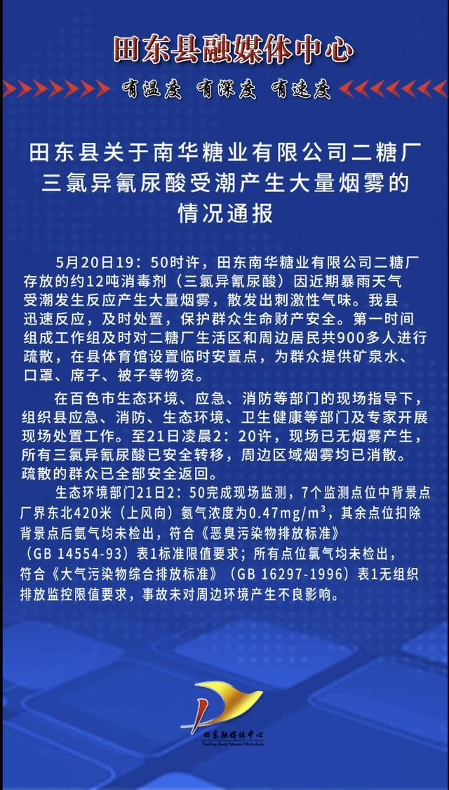 5 月 21 日," 芒乡田东 " 视频号发布《田东县关于南华糖业有限公司二糖厂三氯异氰尿酸受潮产生大量烟雾的情况通报》: