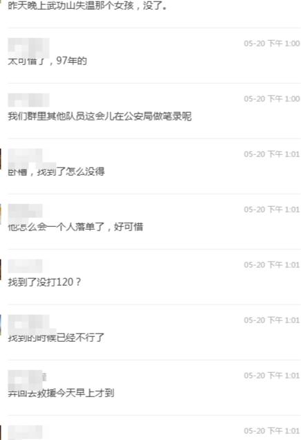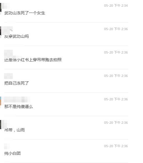 网传的截图中,社交平台上有网友在讨论此事," 昨天(5 月 19 日)晚上武功山失温的女孩没了 "、" 找到的时候已经不行了 "、" 太可惜了,97 年的 "…… 也有人称,女孩穿着吊带去拍照。