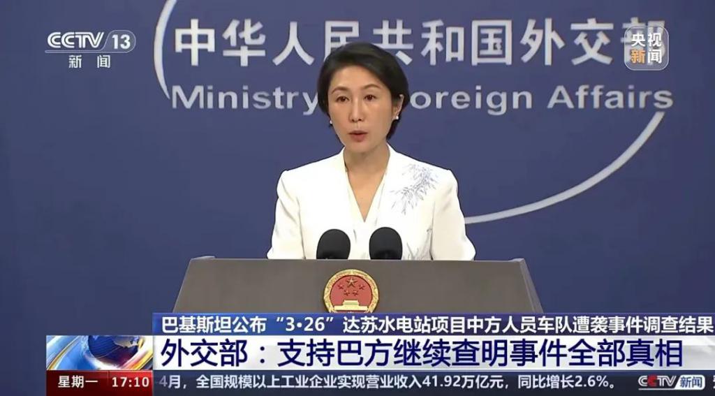 据新华社 5 月 27 日报道,日前,巴基斯坦方面召开新闻发布会公布 "3 · 26" 达苏水电站项目中方人员车队遭遇恐袭事件的调查结果。外交部发言人毛宁 27 日在例行记者会上表示,中方重视巴方对有关恐袭事件的调查工作取得重要进展,支持巴方继续查明全部真相,悉数缉拿真凶并予严惩。