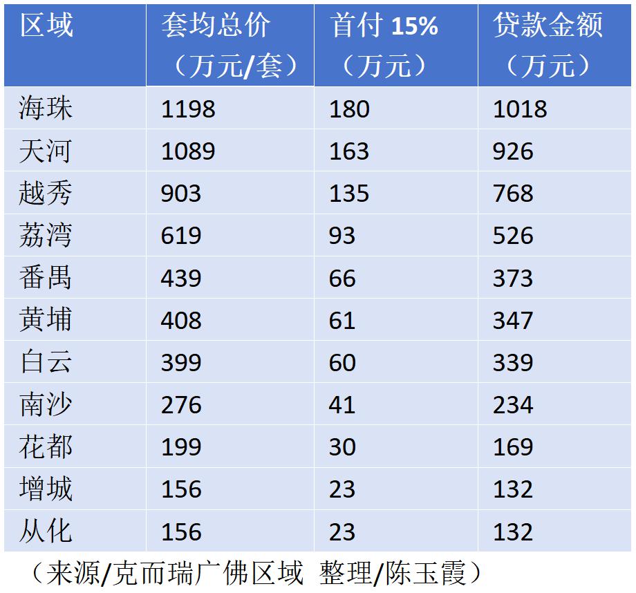 克而瑞对 4 月份广州 11 区楼市整体情况进行跟踪统计发现,中心区的海珠区和天河区一手住宅套均总价分别为 1198 万元和 1089 万元,故其 15% 的首付在 11 区中也相应比较高,分别为 180 万元和 163 万元;刚需产品较为集中的荔湾区,套均总价为 619 万元,首付 15% 则为 93 万元;相对来说,外围区域的入市门槛最低,例如增城区和从化区一手住宅套均总价都是 156 万元,15% 的首付金额为 23 万元。