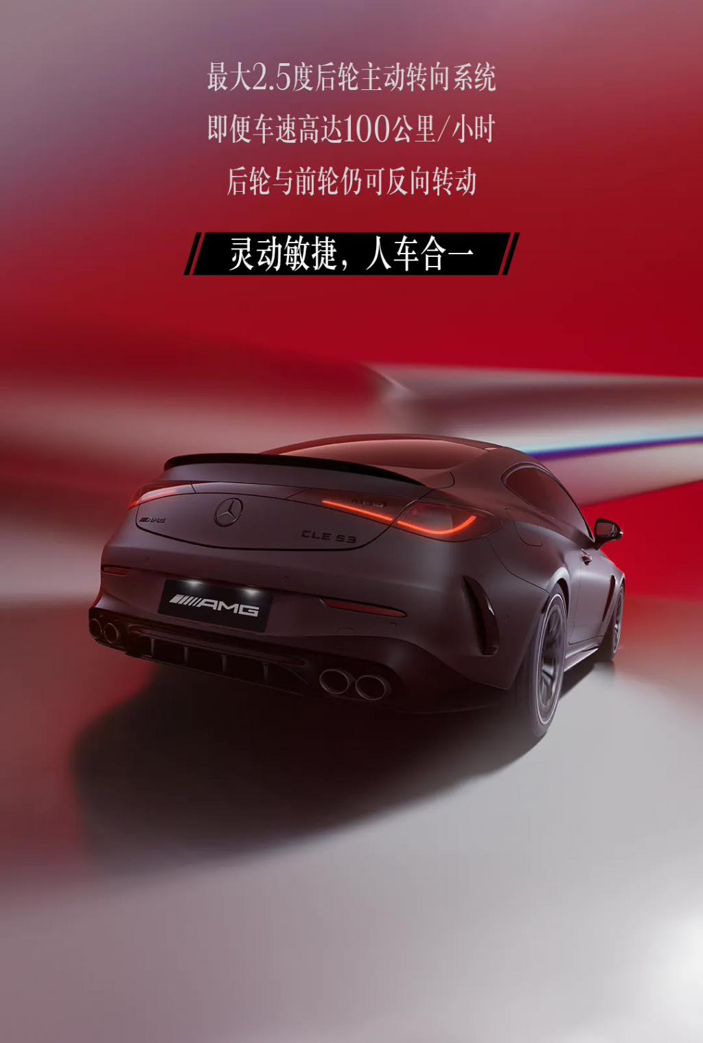 此外,全新 AMG CLE 53 Coupe 提供 5 种 AMG Dynamic Select 驾驶模式可选,并配备后轮转向系统。