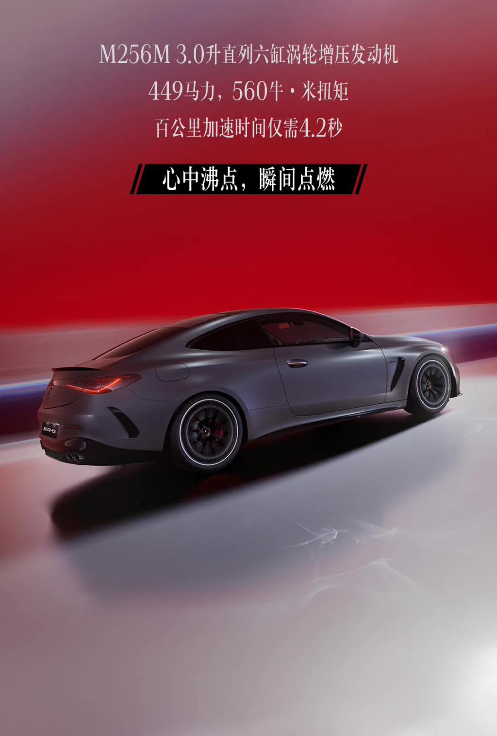 动力部分,全新 AMG CLE 53 Coupe 搭载 3.0T 直列六缸发动机,并匹配 48 伏轻混系统,最大功率 449 马力,最大扭矩为 560 牛・米。
