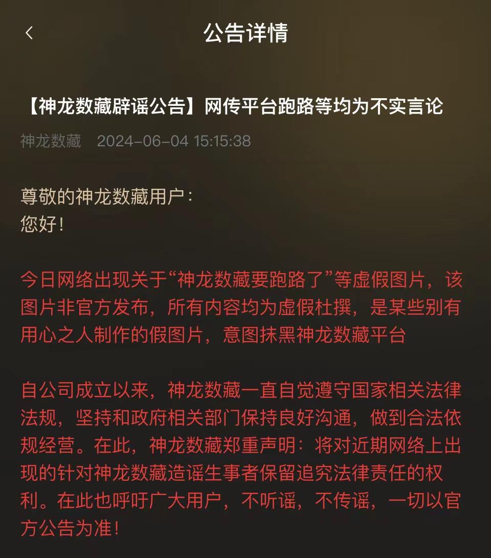 ZAKER 科技消息,6 月 3 日一则关于数字藏品平台神龙数藏 " 跑路 " 的传闻在各大平台流传。网传截图公告称 " 对不起,我们跑路了。"
