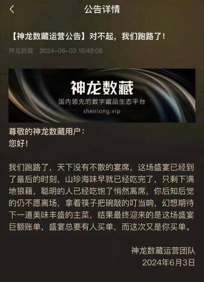 在正文中神龙数藏还称 " 只剩下满地狼藉,聪明的人已经吃饱了悄然离席,你后知后觉的仍不愿离场 "," 盛宴总有人买单,而这次又是你买单。"