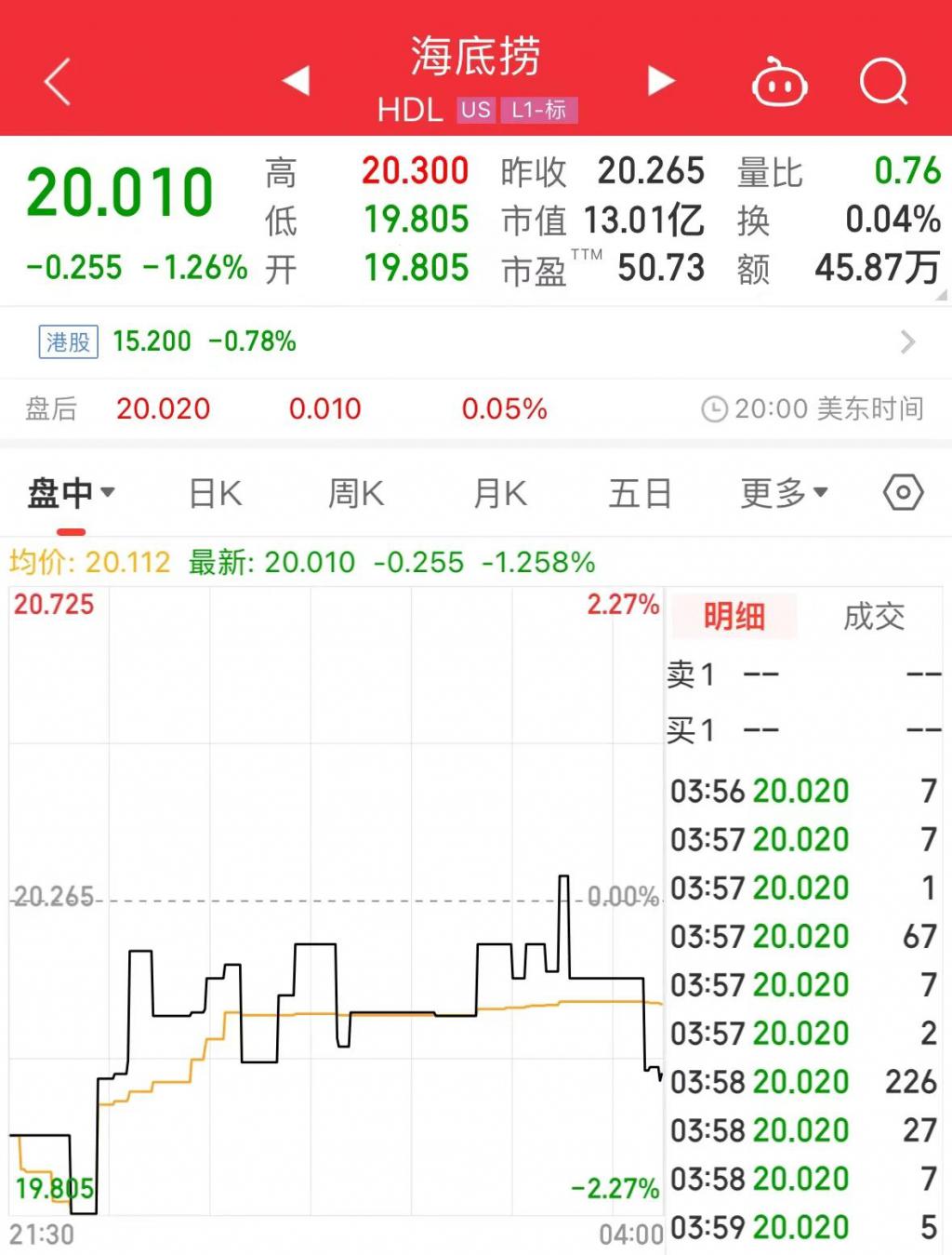 截至 6 月 5 日美股收盘,海底捞报价 20.01 美元 / 股。