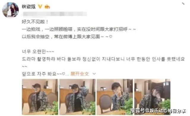 秋瓷炫在社交平台上发布了最新消息,表示最近拍戏再加上照顾孩子,所以没有时间处理社交平台上的问题,但之后会经常和大家见面。在照片中可以看出,秋瓷炫的状态还是很好的,她也为没有更新动态而向自己的粉丝道歉。