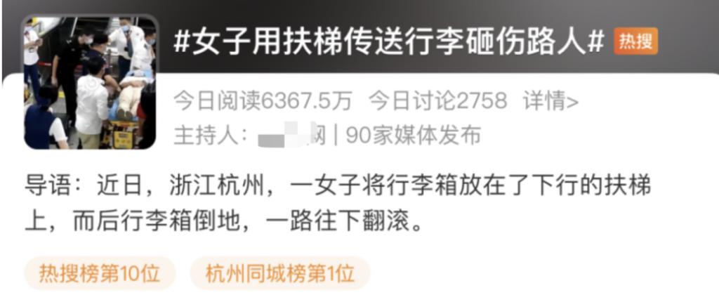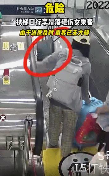 8 月 29 号下午五点半,在杭州地铁打铁关站,一位张女士下班回家,正乘坐下行扶梯进站的时候,突然听到身后传来连续的碰撞声,转身一看,是一个大行李箱!