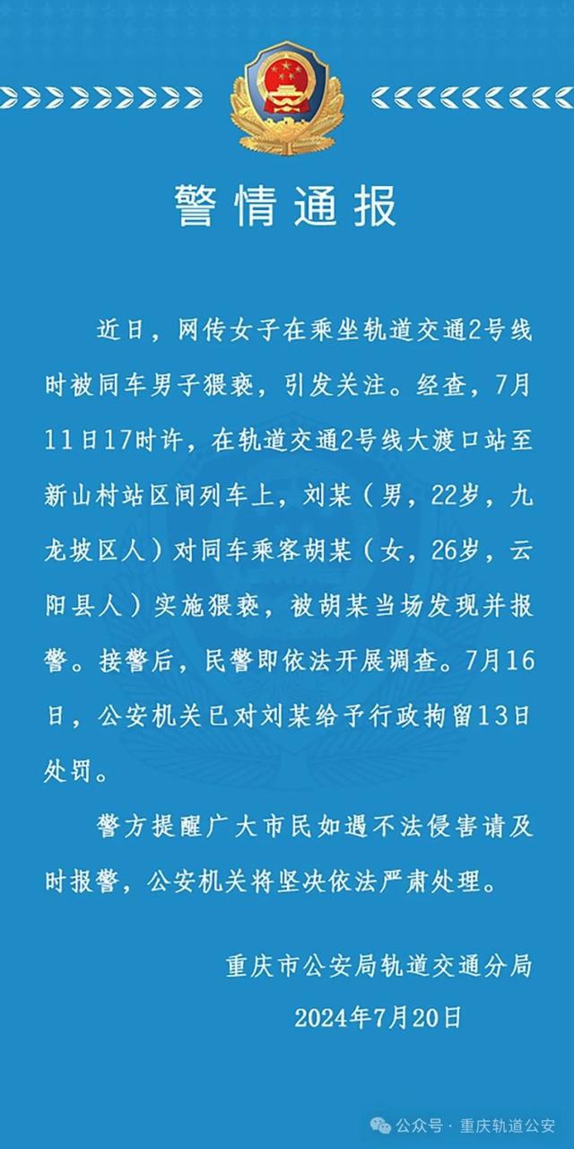 7 月 20 日,重庆警方通报,11 日,轨道交通 2 号线列车上,22 岁男子刘某对同车 26 岁乘客胡某实施猥亵,被胡某当场发现并报警,警方已对刘某行政拘留 13 日。