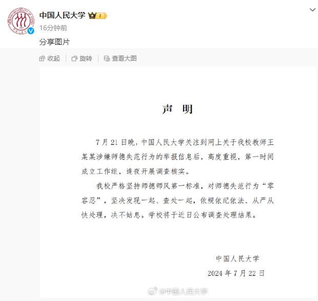 7 月 22 日早,@中国人民大学 回应此事,表示在关注到举报信息后高度重视,已第一时间成立工作组,连夜开展调查核实。学校将于近日公布调查处理结果。