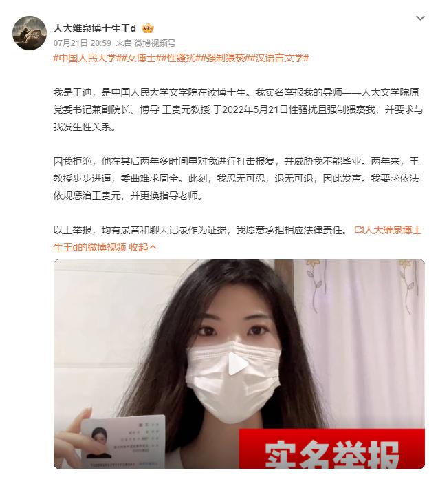 7 月 21 日晚,一位自称是中国人民大学文学院在读博士生的博主实名举报其导师——人大文学院原党委书记兼副院长、博导王贵元,表示导师于 2022 年 5 月 21 日对她实施性骚扰且强制猥亵。
