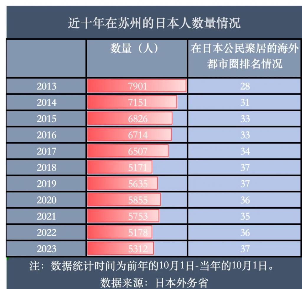 紧密的经贸往来也使得生活在苏州的日籍人士越来越多。日本外务省数据显示:截至 2023 年 10 月 1 日,在苏州定居的日籍人士有 5312 人,在日本公民聚居的海外都市圈中排名第 37。苏州已成为日籍人士在中国最为集聚的城市之一。