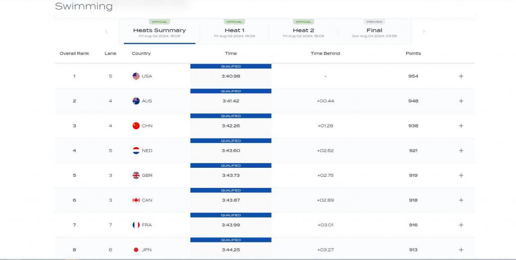 北京时间 8 月 2 日傍晚,巴黎奥运游泳大项结束了男女 4x100 混预赛争夺。徐嘉余、唐钱婷、张雨霏和潘展乐组成的中国队。以 3 分 42 秒 26 排名小组第二,总排名第三进决赛。