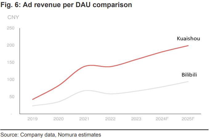 根据野村集团的估计,B 站 2024 财年每位日活跃用户的广告收入为 79 元人民币,而快手每位日活跃用户的广告收入则为 181 元人民币。