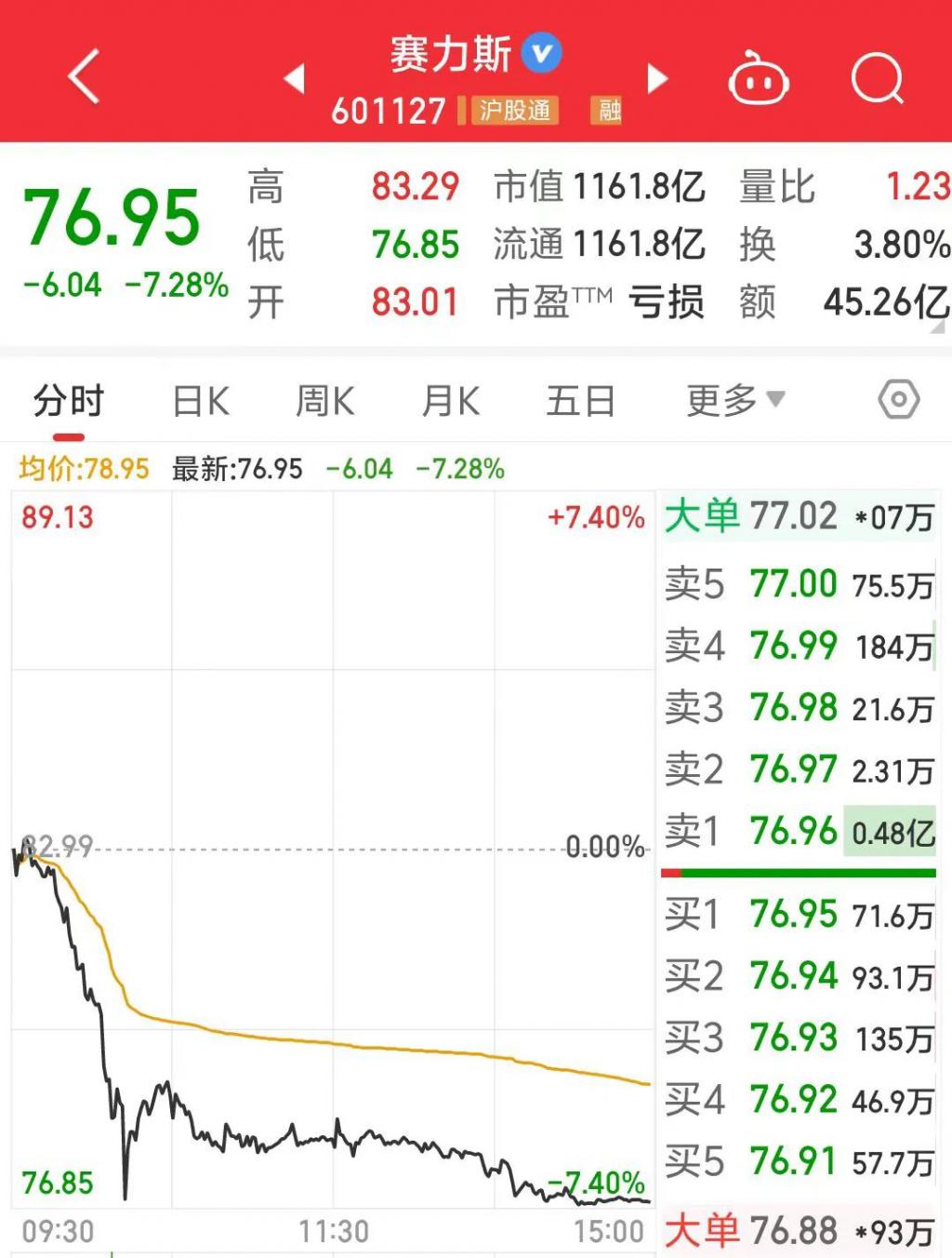 8 月 22 日,赛力斯股价大跌 7.28%,报 76.95 元 / 股,总市值 1162 亿元。