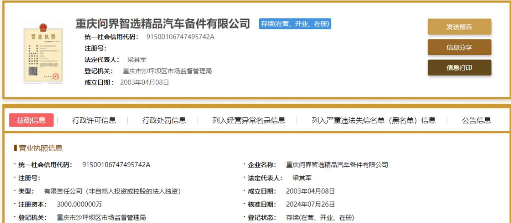 国家企业信用信息公示系统显示,赛力斯旗下的 " 赛力斯汽车销售有限公司 "8 月 19 日名称变更为 " 重庆问界汽车销售有限公司 "。