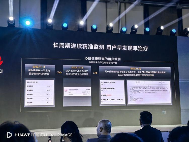 在 2023 年 11 月 11 日,华为手表在监测数据时发现一名用户在一天内疑似心脏早搏 19 次。于是与华为健康合作的 301 医院在 11 月 15 日主动联系了该用户,提醒用户需要注意心脏健康。次日,该用户前往医院进行动态心电图数据检查,结合 24 小时多次出现多次室性早搏,医生在检查后判断是由高血压引起的。