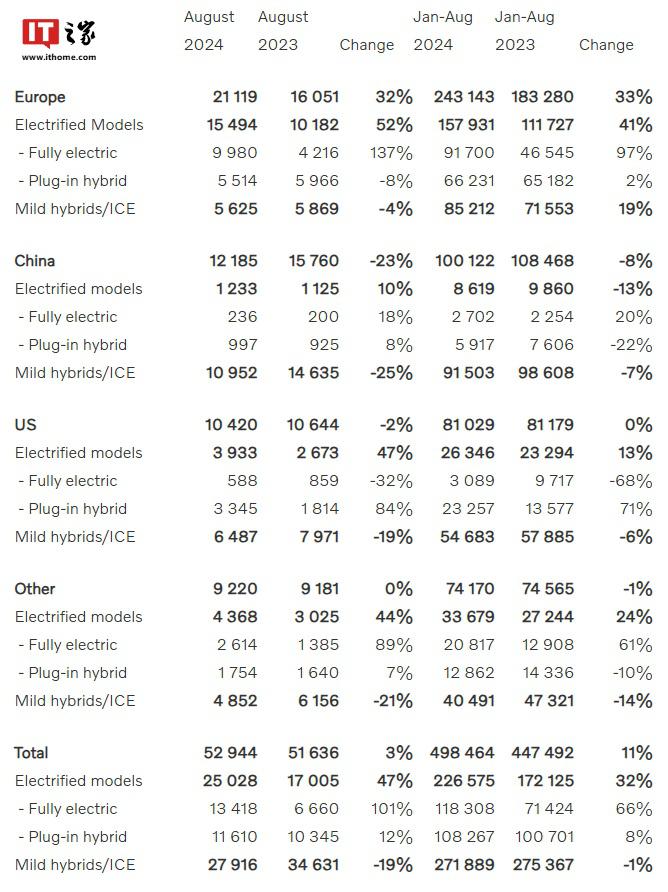 中国市场方面,沃尔沃汽车 8 月销量达到 12,185 辆,与 2023 年 8 月相比下降了 23%。然而,电动汽车(IT 之家注:纯电和插电式混合动力汽车)的销量与去年同期相比增长了 10%,达到 1,233 辆。
