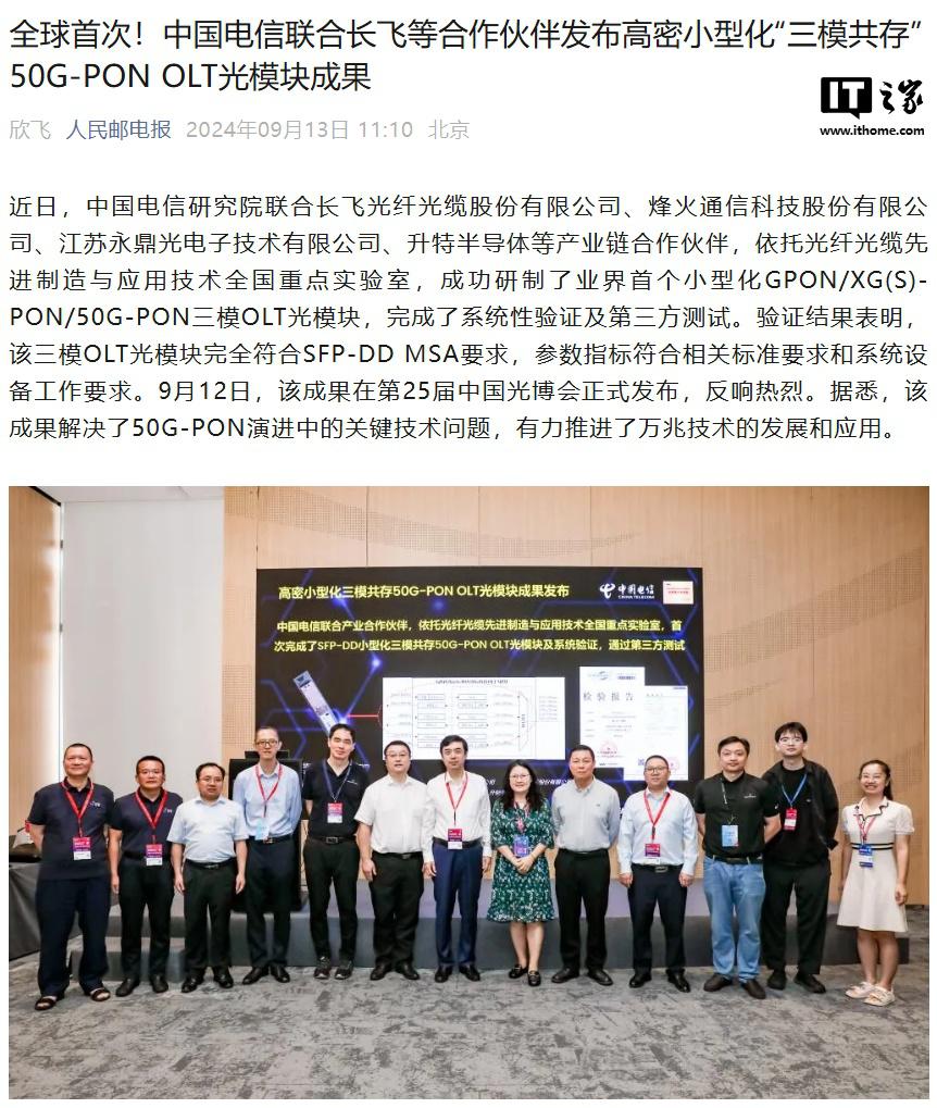 IT 之家 9 月 13 日消息,据人民邮电报今日报道,中国电信研究院联合长飞光纤光缆股份有限公司、烽火通信科技股份有限公司、江苏永鼎光电子技术有限公司、升特半导体等产业链合作伙伴,依托光纤光缆先进制造与应用技术全国重点实验室,成功研制了业界首个小型化 GPON / XG ( S ) -PON / 50G-PON 三模 OLT 光模块,完成了系统性验证及第三方测试。
