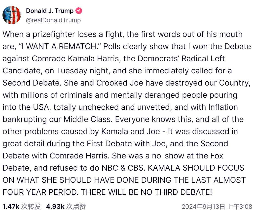财联社 9 月 13 日讯(编辑 史正丞)北京时间周五凌晨 3 点,美国总统大选候选人唐纳德 · 特朗普正式否决了 " 与哈里斯再战一场 " 的可能性。
