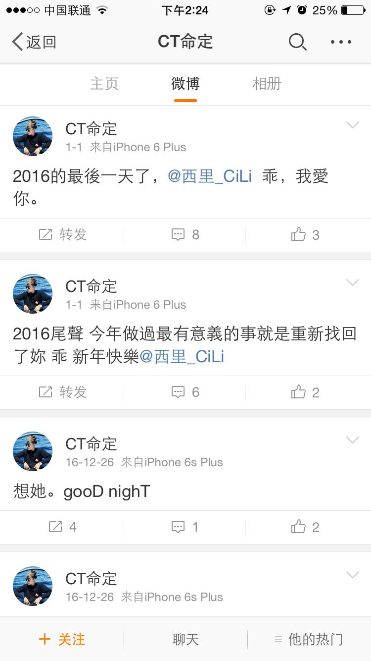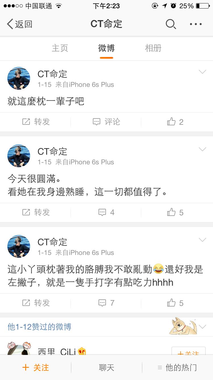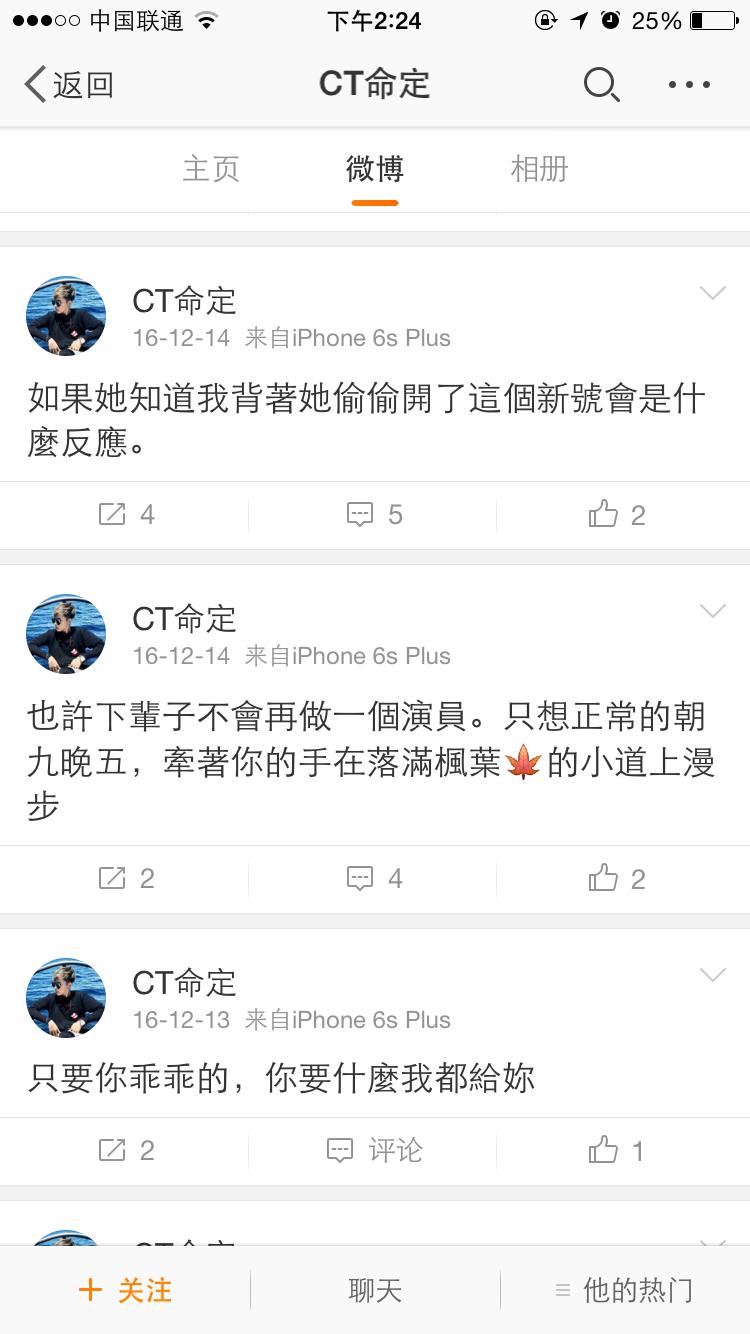 然后再来说个打脸的事情,你们偶像不是低调、零绯闻吧。接下来我们就来研究一下唐禹哲的这个小号昵称吧#CT命定#,也是够少女呢~容zuo大胆猜测,这个“C”莫不是取自绯闻女友#西里_CiLi#中的C吧,“T”莫不是取自唐姓的拼音大写“T”吧,然后“命定”就是命中注定咯?啧啧啧,好玛丽苏有没有!!!一个34岁男人的网名寓意也是够了呢~