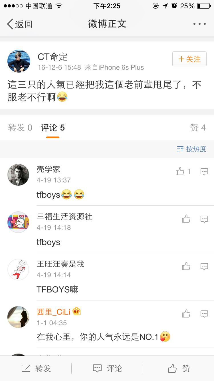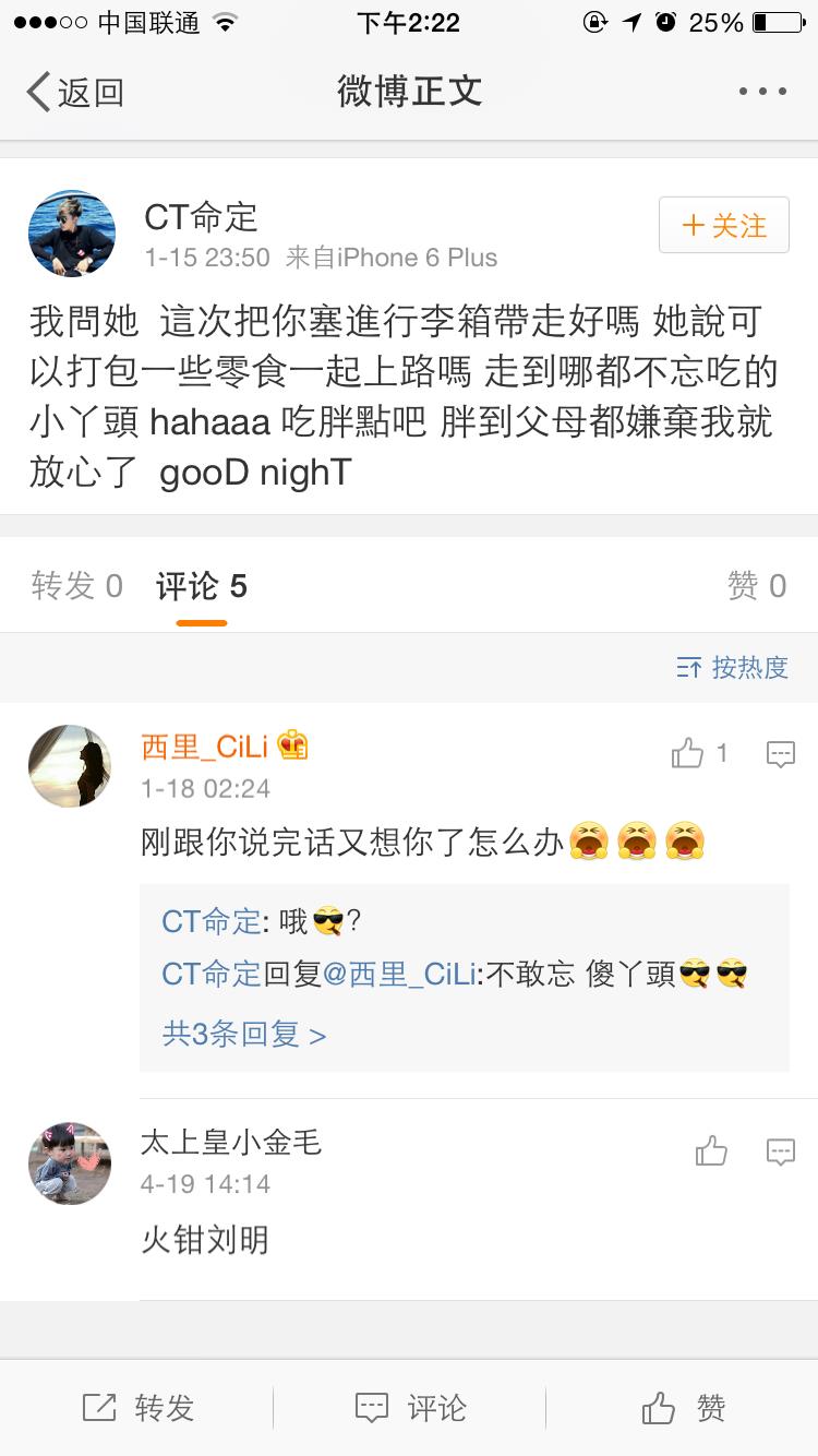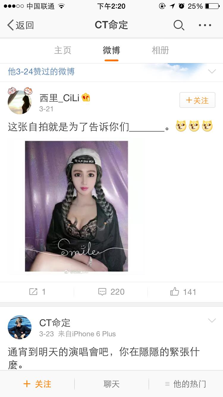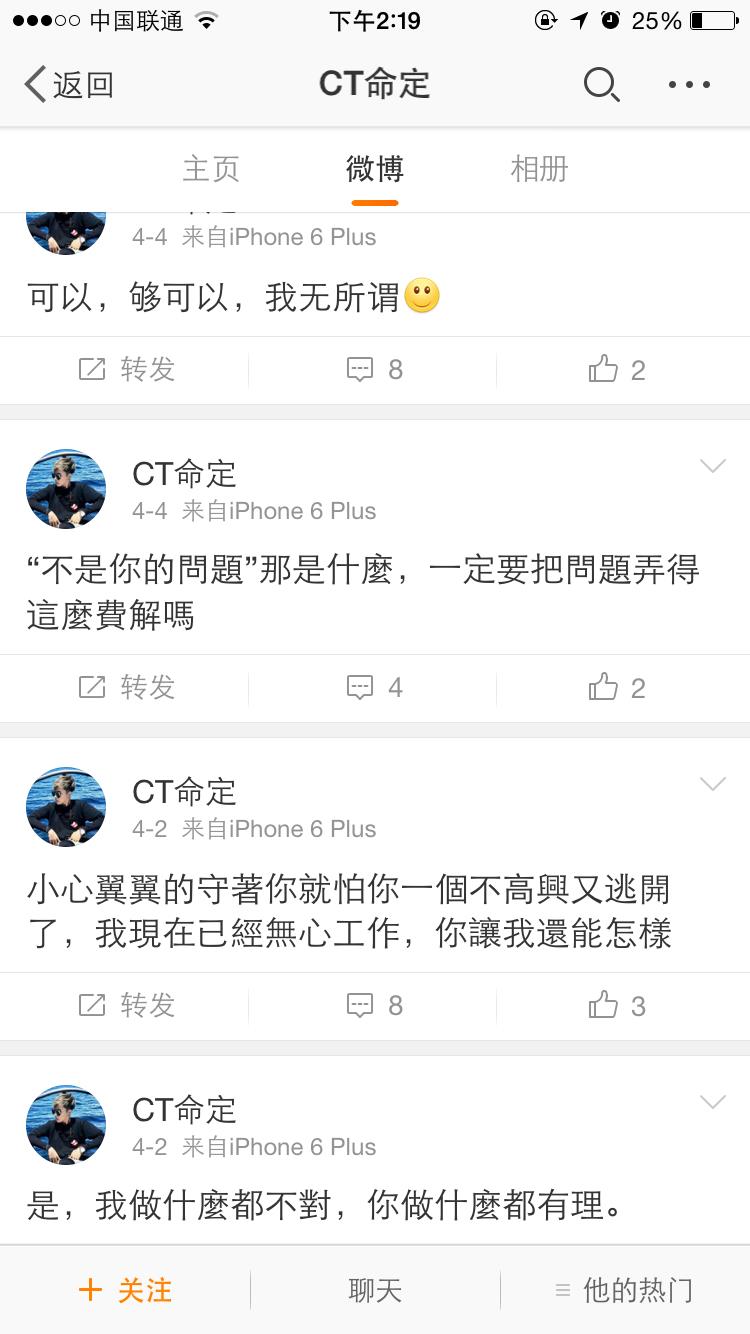 然后再来说个打脸的事情,你们偶像不是低调、零绯闻吧。接下来我们就来研究一下唐禹哲的这个小号昵称吧#CT命定#,也是够少女呢~容zuo大胆猜测,这个“C”莫不是取自绯闻女友#西里_CiLi#中的C吧,“T”莫不是取自唐姓的拼音大写“T”吧,然后“命定”就是命中注定咯?啧啧啧,好玛丽苏有没有!!!一个34岁男人的网名寓意也是够了呢~