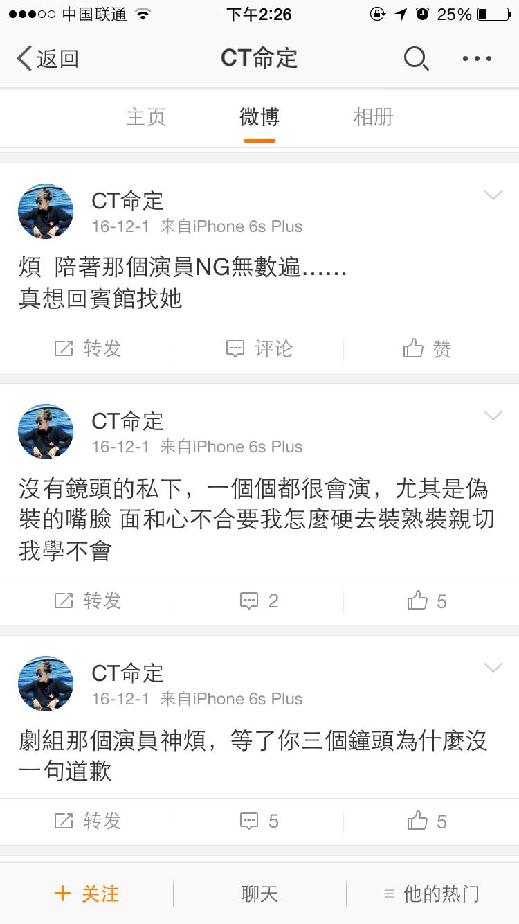 然后再来看看这个小号每天发的内容吧。要说是小号的话,应该就是公众人物放飞自我的私人领域咯,所以也是内心的真实写照咯。看看唐禹哲的小号微博每天都发的啥!背地里说合作女演员的坏话、宣传自己的作品、写给P友的情话、开开车等等等等,简直就是一本《少男的日记》嘛。(zuo怕晚点小号清空微博,索性基本截图存根了。也是操碎了心。。。。)
