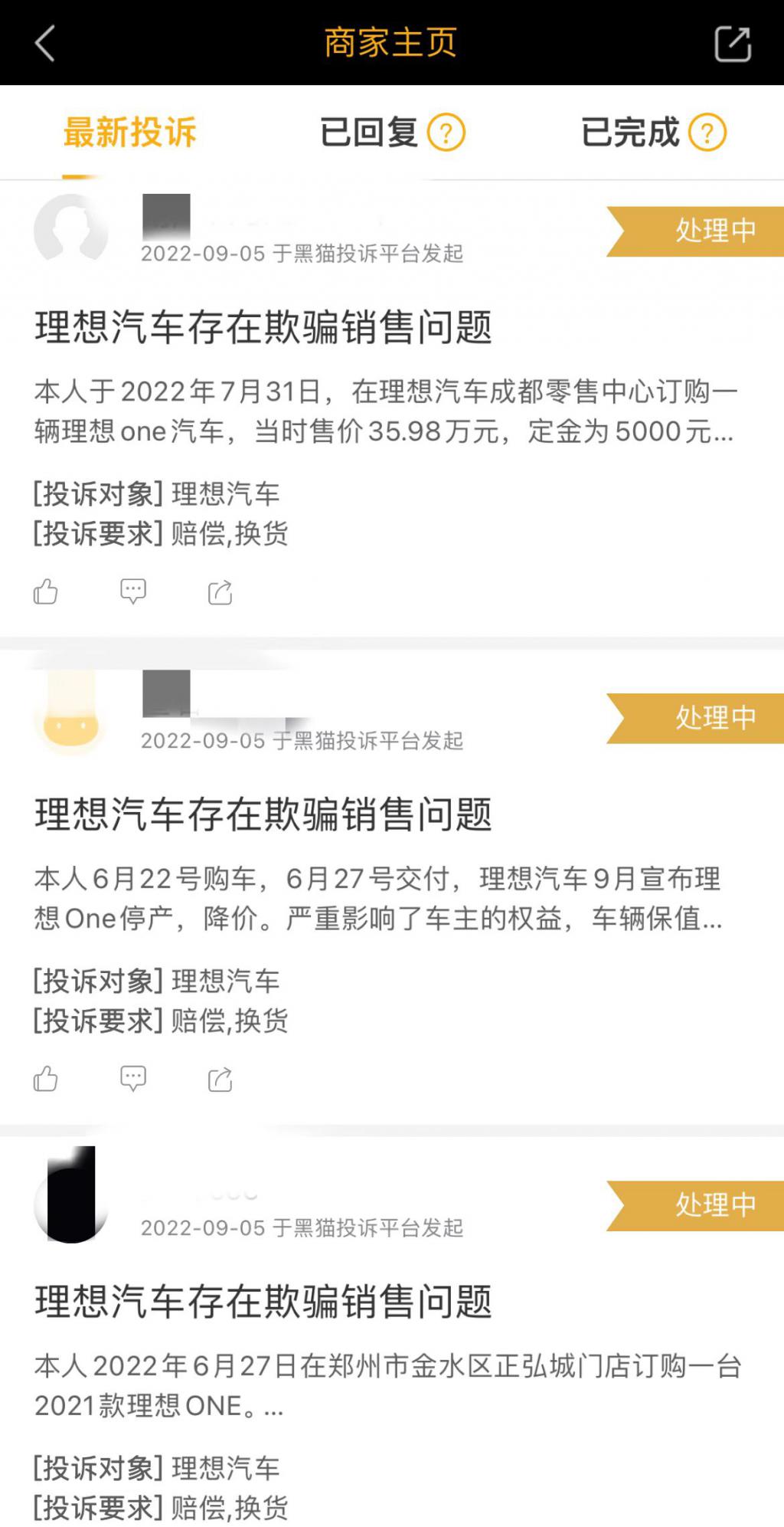 近几日,多位理想车主在黑猫投诉、车质网等平台上投诉,重点大多集中在理想销售欺诈、隐瞒相关信息、虚假宣传,称理想方面在未提前告知的情况下突然变向将理想 ONE 的价格降低了约 2 万元,并将在 10 月停产该车型。