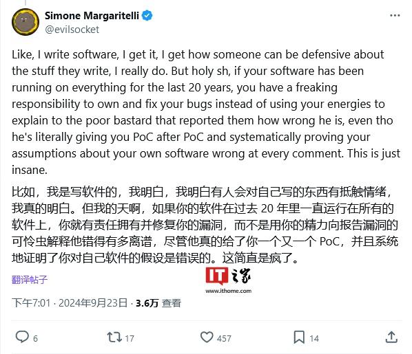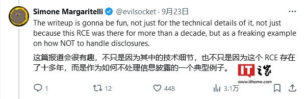 软件开发人员 Simone Margaritelli 于 9 月 23 日在 X 平台发布推文,率先曝料了这些 RCE 漏洞,目前已经通知相关开发团队,并会在未来两周内完全披露。