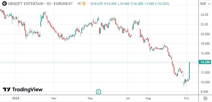 受这一消息的影响,在法国上市的育碧周五收涨 33.52%,是该股 1996 年 IPO 以来的最大单日涨幅。尽管如此,该股年初至今累跌约 40%,公司最新总市值为 20.3 亿美元。