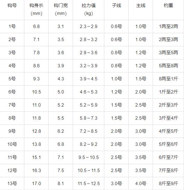 鱼钩规格尺寸一览表