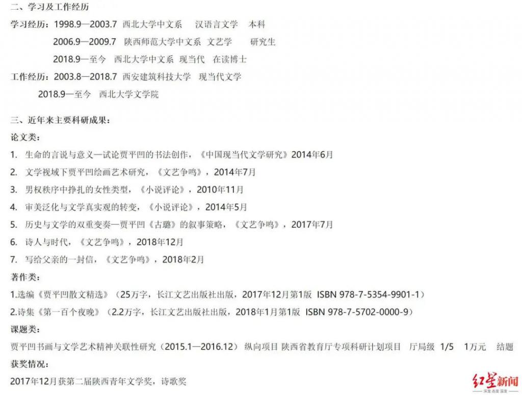 贾浅浅个人履历及作品,图据西北大学官网