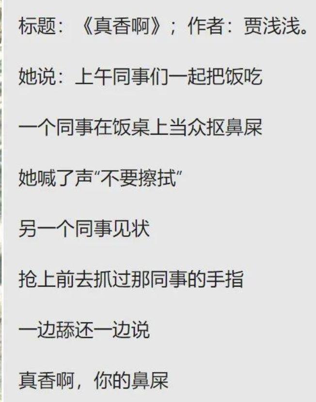 诗人、中国社会科学院外国文学研究所学者戴潍娜介绍自己开会时见过贾浅浅,但没有交流,回忆其发言很真诚。" 因为这个热点,才去读了一点她的诗,发现并不都是(被评论的那几首)那样子的,她也写过一些语感很好的诗。单揪住几行不放,这就跟郑爽事件里六小时的录音只放出几分钟是一种性质。但大众集体快感就是这样,抓住一个兴奋点,无限放大。" 戴潍娜表示," 这是诗歌在这个时代的悲剧。你会发现,诗坛上真正好的诗,有力量的诗,或者哪怕就是贾浅浅个人最高水准的诗,是没有机会传播出去的。而最刺眼的东西会被无限放大,成为一个网络兴奋剂,成为能把所有人都吸 high 了的大瓜。我们这个社会没有耐心去读一行好诗,但一首烂诗,大家都饶有兴趣去踩一踩。"