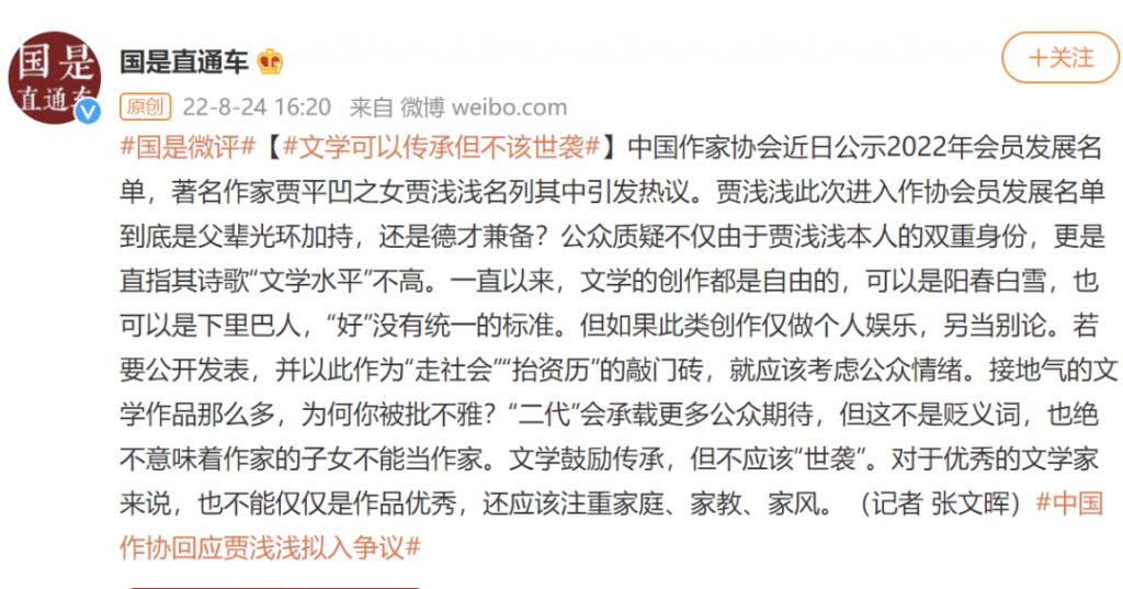 对此,中新社国是直通车评论称:贾浅浅此次进入作协会员发展名单到底是父辈光环加持,还是德才兼备?公众质疑不仅由于贾浅浅本人的双重身份,更是直指其诗歌 " 文学水平 " 不高。