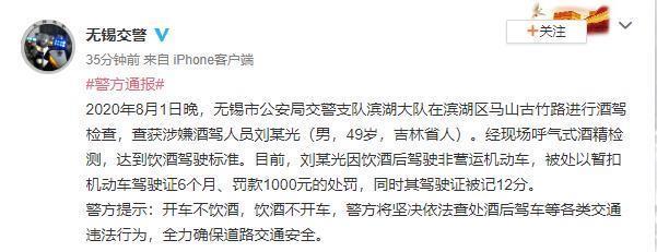 8月4日,据无锡交警官方微博消息,刘小光因酒后驾车被警告。