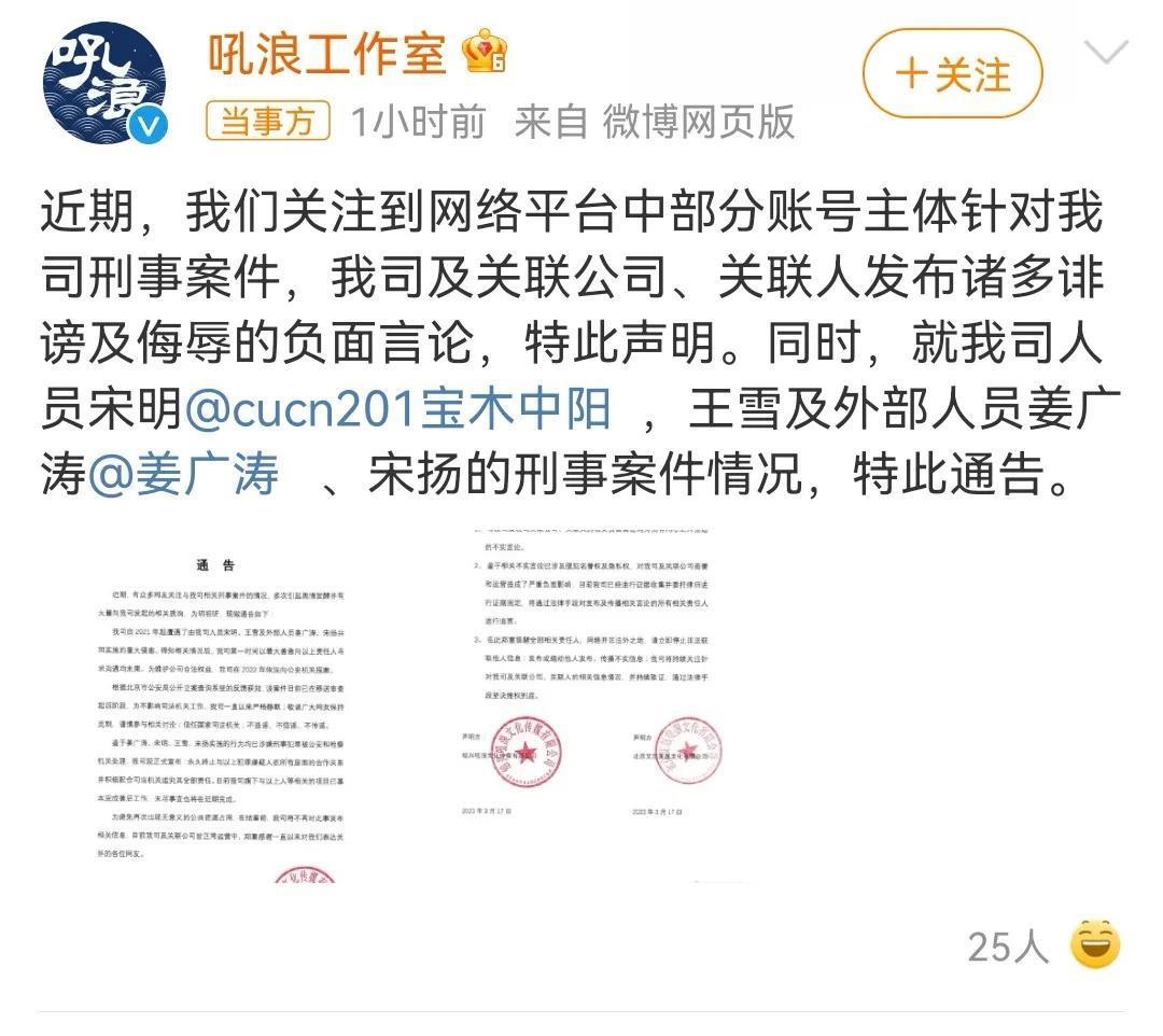 2023年3月17日下午四点,配音演员姜广涛所属公司发布通告,表明姜广涛、宋明等人违法犯罪,目前案件处于公安机关移交检察院审查起诉阶段,这就意味着姜广涛等人触犯刑法,需经过司法机关审判。