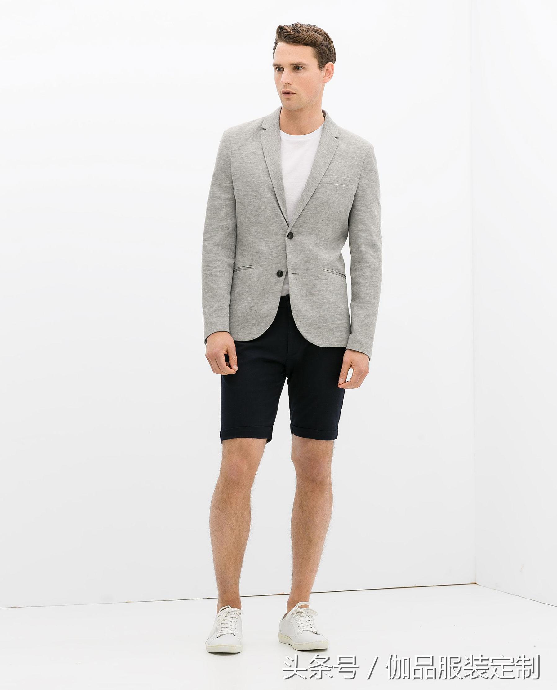 4、西装搭短裤时,鞋子可以穿皮鞋、乐福鞋,而如果西装是休闲风格,也可以搭白色板鞋,要知道,白色板鞋是夏天最百搭的鞋款了!