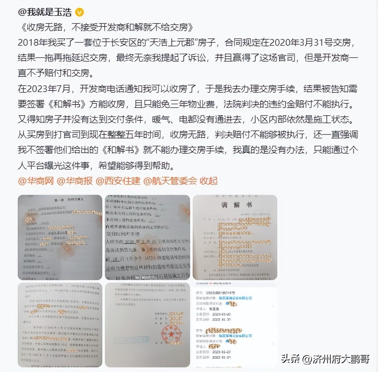 他曝出,他2018年买的房子,原定于2020年3月31号交房,可是开发商却是一拖再拖,无奈之下的玉浩,起诉了开发商,虽然他胜诉了,却遭遇到了开发商的欺负,房子没有达到交付条件,,暖气、电都没有通进去,却让他签《和解书》方能收房,不签,就不给他交房,而且法院判决的赔付,开发商是一分不给。