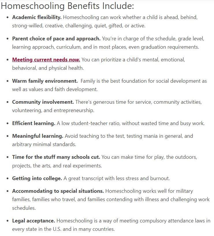 学术灵活性家长选择的速度和方法现在满足当前的需求温馨的家庭环境社区参与高效学习有意义的学习有时间学许多学校削减的东西进入大学适应特殊情况法律接受