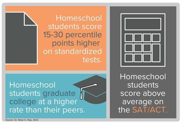 在家上学的美国中小学生们并不比在校受教育的学生逊色。国家家庭教育研究所 (National Home Education Research Institute–NHERI) 2016 年的一项研究表明,在家上学的学生在标准化的学业成绩测试中得分高出 15 到 30 个百分点。研究还表明,接受家庭课程教育的学生通常在 SAT/ACT 上得分更高。
