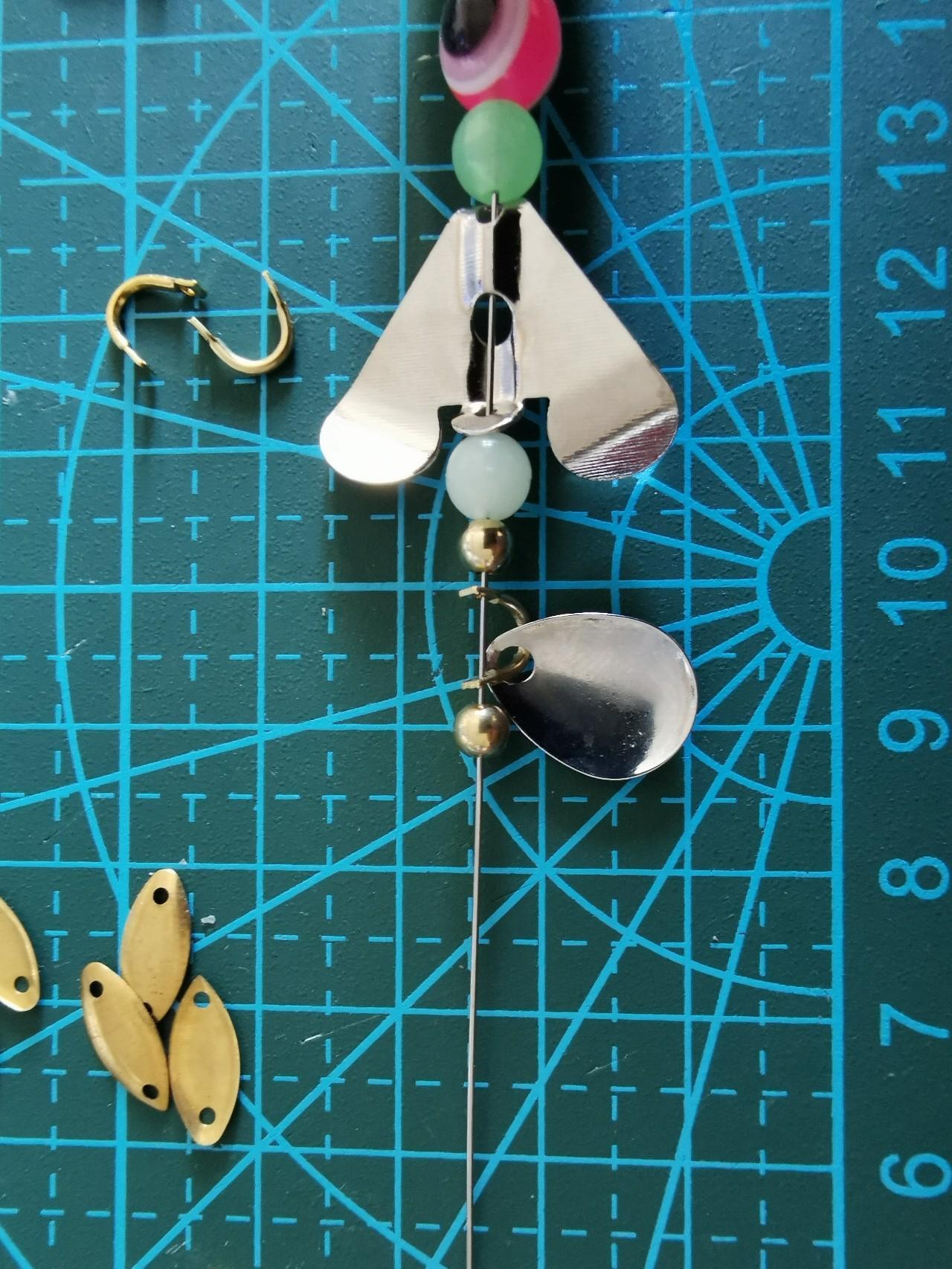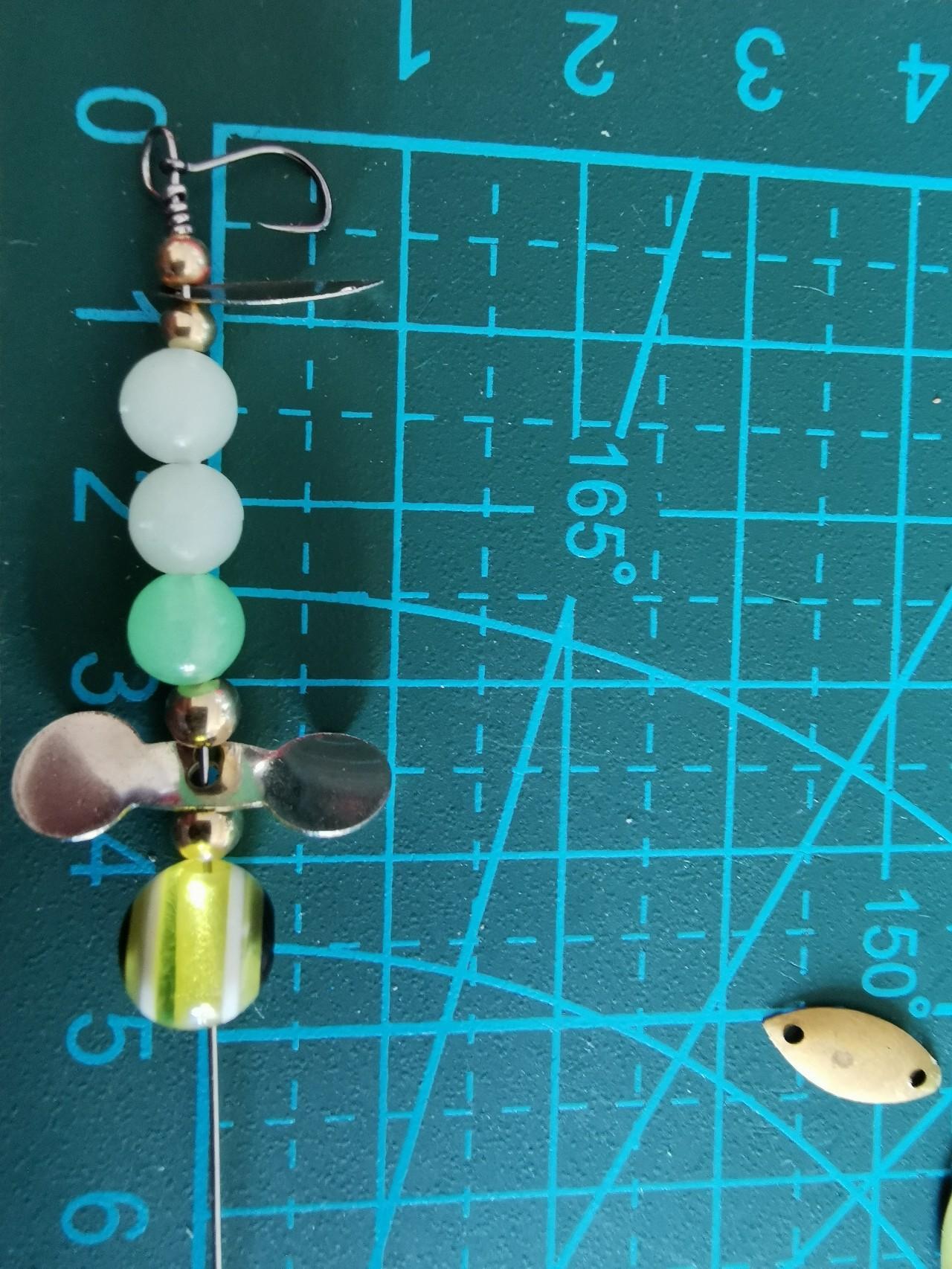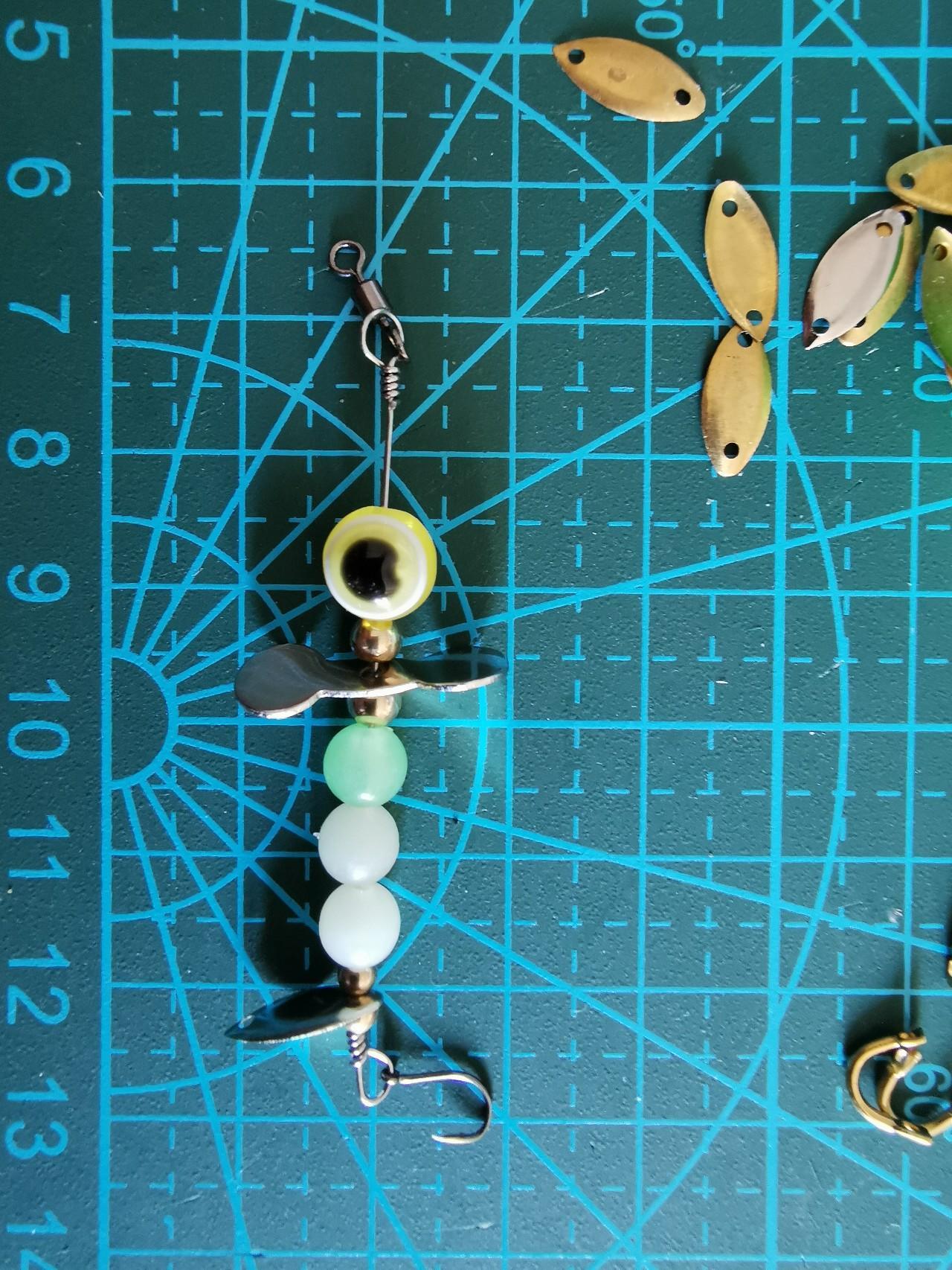 这一组是克数稍大一些。我采用的是助投器一体的,下配鱼眼挡珠(模仿鱼眼)蝴蝶旋转亮片 瓜子亮片 铜扣(加大旋转力)铜珠(配重及美观)后挂8字环配20号三爪锚钩。这一组比上一组重量大不少,在路亚抛竿时可以中远投。