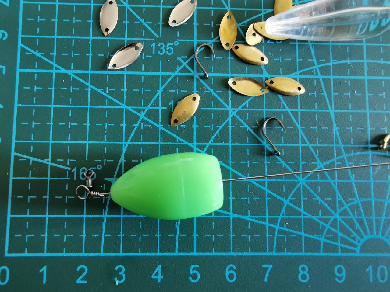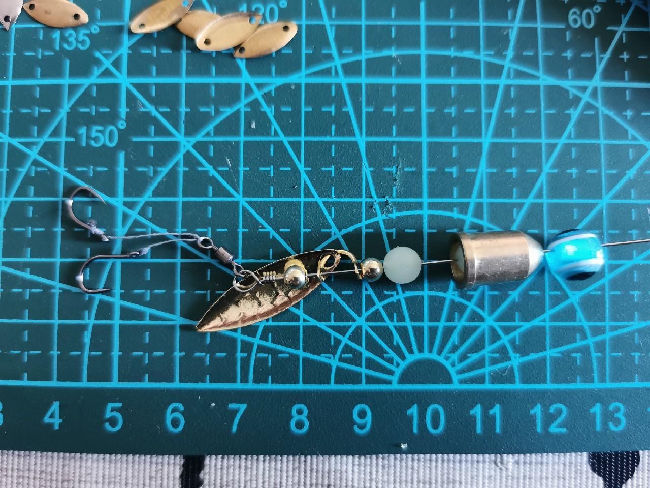 这一组也是小克重的。主要是一开工,根本停不下来,结果还见血了。不过这组我配的是尾部双沟,中间部分加了一个2克重的子弹铅,头部是旋转复合亮片增加诱鱼功能。这款中近抛投应该没有什么太大问题,就是尾部双沟绑的有点问题(有点缠绕),有时间我再改良一下。我的作品希望大家能喜欢,请各位钓友指正批评。
